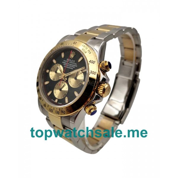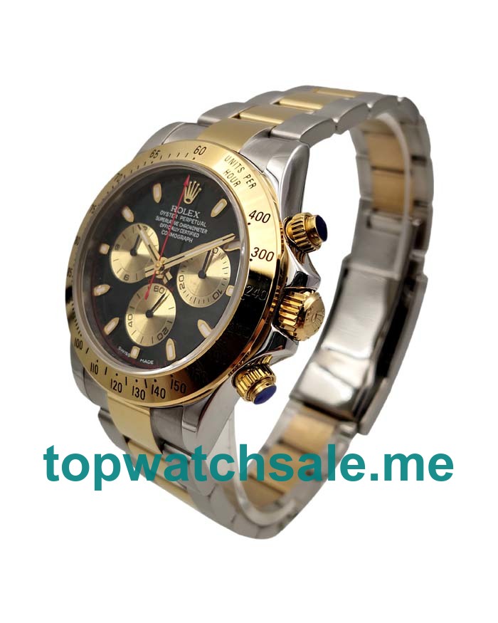 The UK 1:1 cheap Rolex Cosmograph Daytona replica watches are made of steel and yellow gold cases and bracelets, with black dials and champagnes subdials. The high quality fake watches look luxurious and elegant.